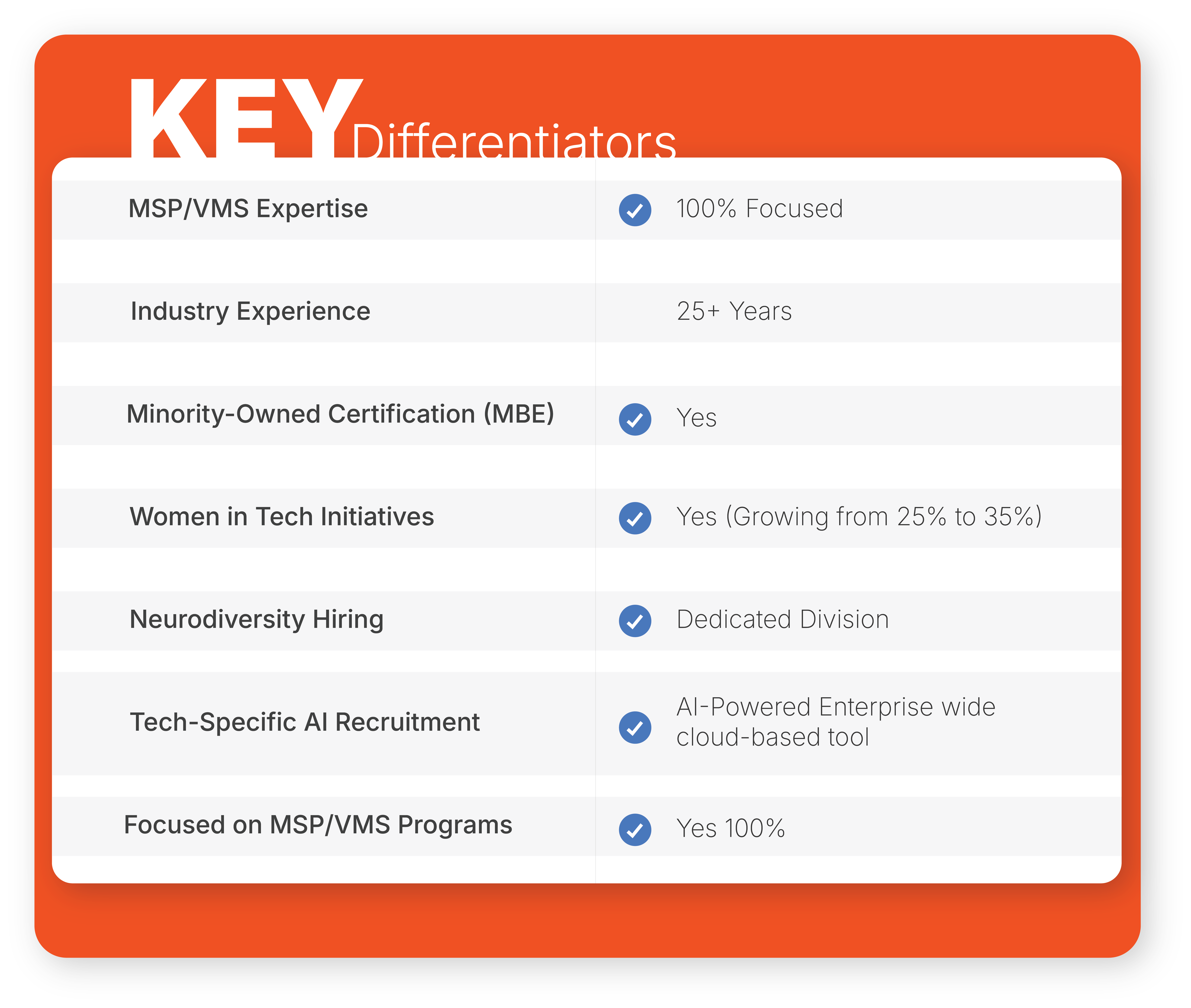 We specialize in IT, healthcare, financial services, banking, insurance, engineering, and telecom staffing, ensuring that our clients have access to top-tier talent in their respective industries. As a 100% MSP/VMS-focused firm, we streamline hiring processes, ensuring fast deployment, compliance adherence, and seamless workforce integration. Our AI-powered recruitment technology, coupled with dedicated Account Managers, ensures a personalized and efficient hiring experience, helping clients optimize workforce performance, reduce hiring time, and achieve long-term staffing success.